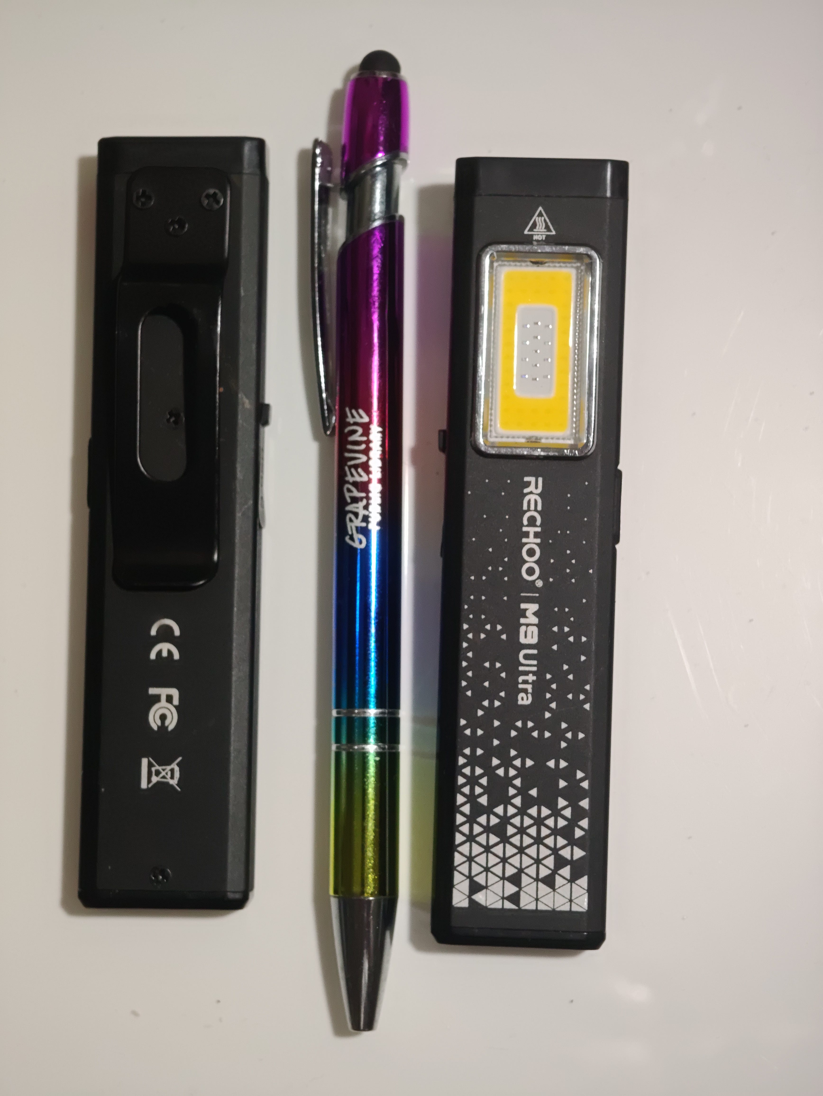 The RECHOO Flat EDC Rechargeable Flashlights weigh less than a pair of AA batteries, have a clip for hands-free work, a magnet in the bottom for even more hands-free options, a regular flashlight mode with the LED in the top, and a lantern mode with the LED on the side.